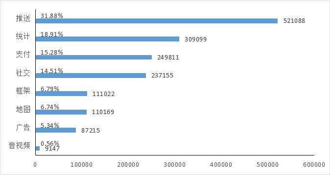 第三方SDK应用广泛,其自身安全性和收集使用个人信息的行为也存在隐患。监测发现截止9月底,31.88%的App嵌入推送类的SDK,共计应用521088款;18.91%的App嵌入统计类的SDK,共计应用309099款;15.28%的App嵌入支付类的SDK,共计应用249811款,详见下图: