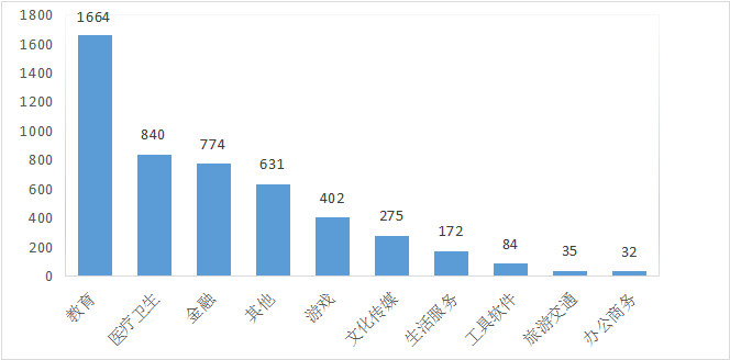 从应用行业上看,教育类仍是新增应用的主要类别,占新增应用33.83%;医疗卫生类新增数量位列第二,占新增应用17.08%;金融类新增数量位列第三,占新增应用的15.74%;详见下图: