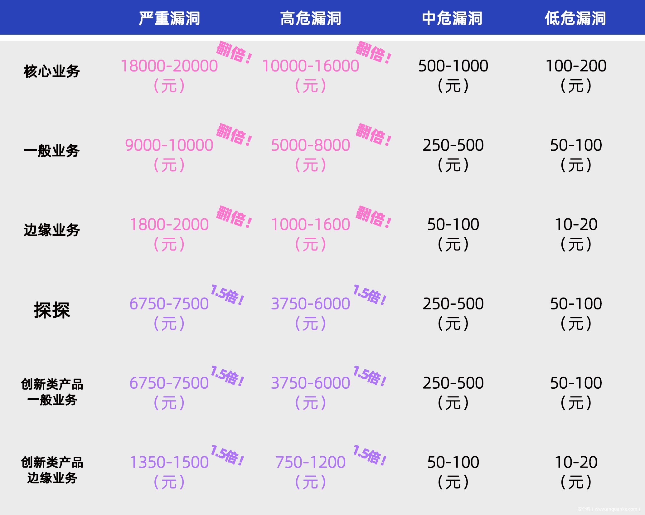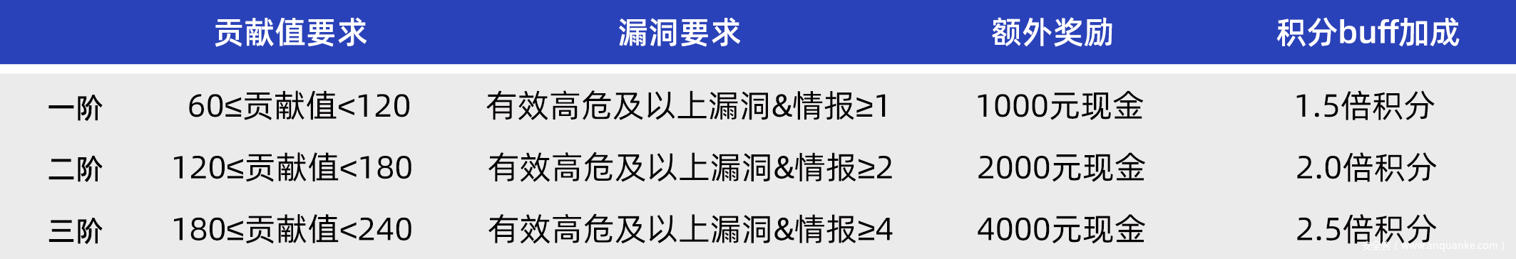 本次活动期间收到的首个核心业务有效高危/严重漏洞&情报,我们将额外送出6666元现金红包奖励???!!不光如此,在活动前三天(4.19-4.21)所提交的全部有效漏洞,每个额外奖励88元小红包?(紧紧抱住大佬的大腿)
