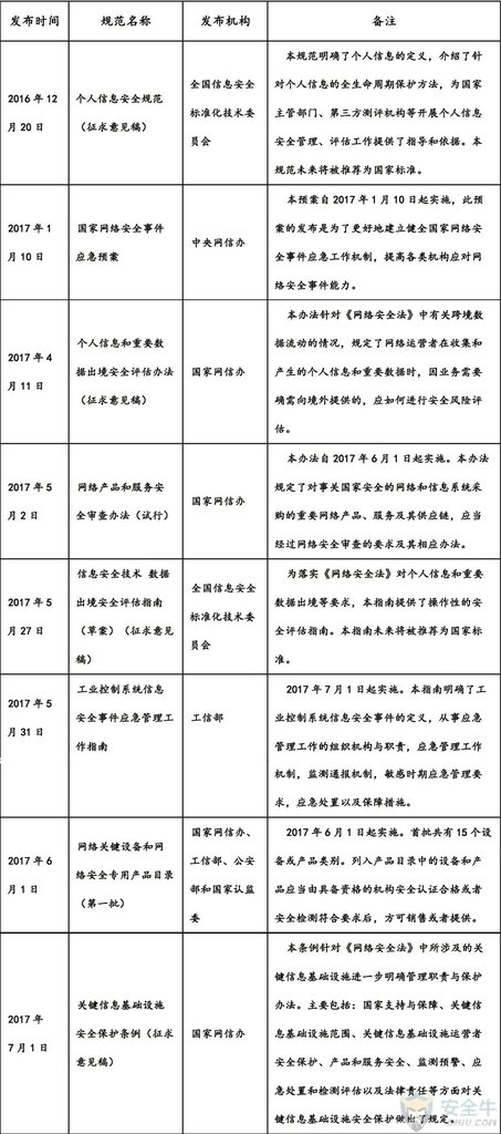 2017年,主管部门及安全标准化机构发布了多个与《网络安全法》实施相关的法规与标准,有的还处在征求意见当中。为方便各类机构在实施《网络安全法》时加以参考,把最重要的相关法规与标准列表如下: