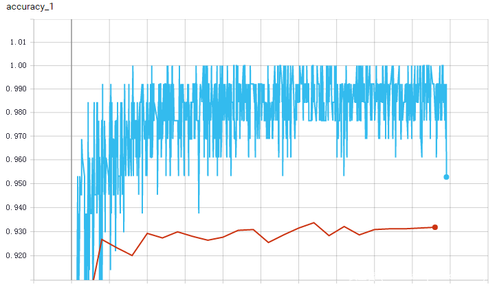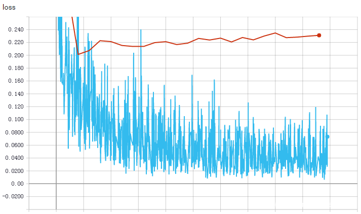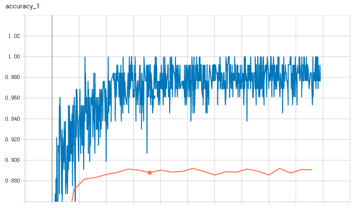 下面给出了随着训练次数增加算法在训练集和测试集上的准确率和损失值变化。蓝色线表示训练集上效果,橙色线表示测试集上效果。可以看到,在迭代到1600个batch后,算法效果已经基本趋于稳定,训练集准确率在98%附近波动,损失值在0.07附近波动。在测试集上,算法准确率最高点出现在迭代了2600个batch的时候,准确率为89.20%,损失值也在迭代了400个batch后开始发散。