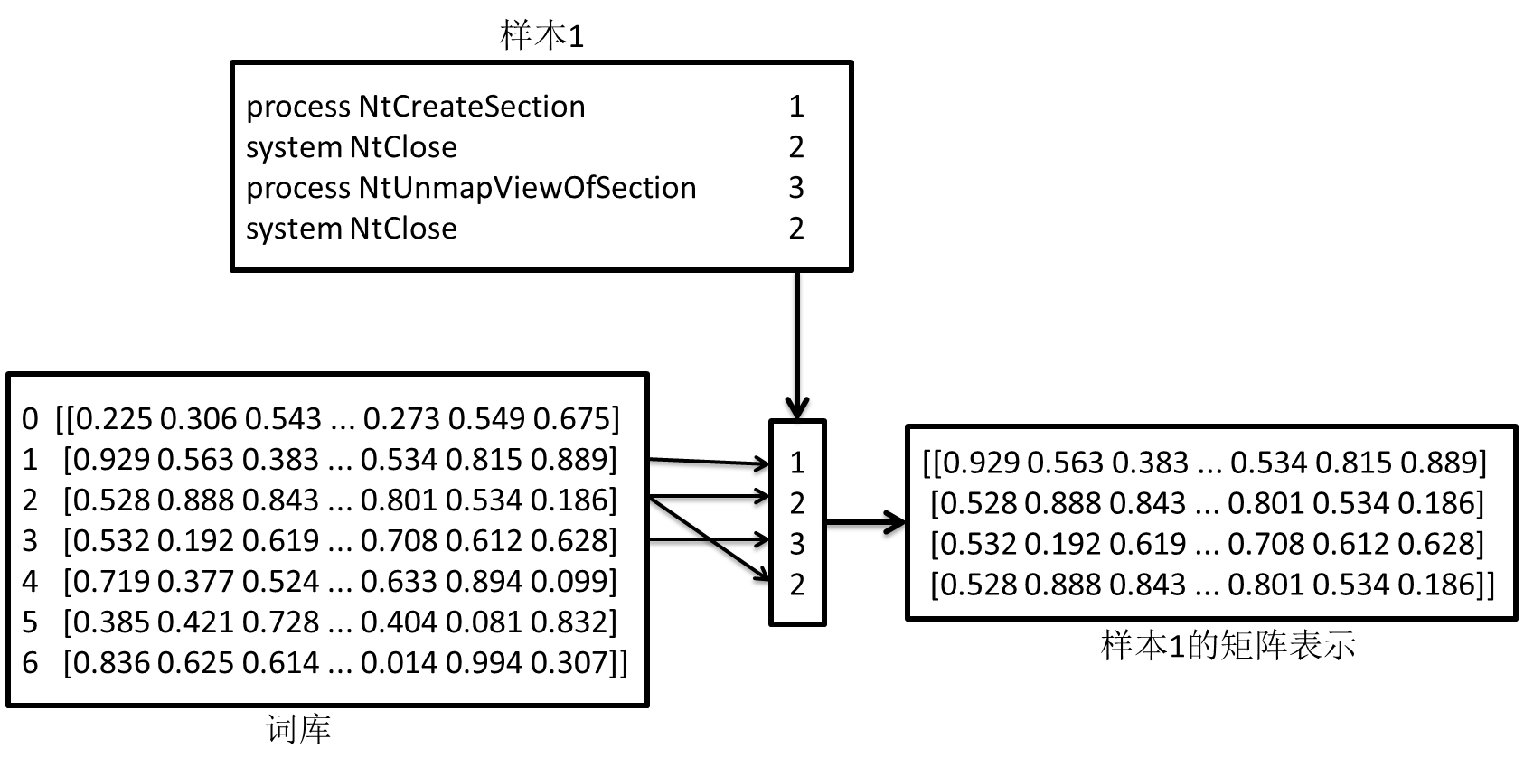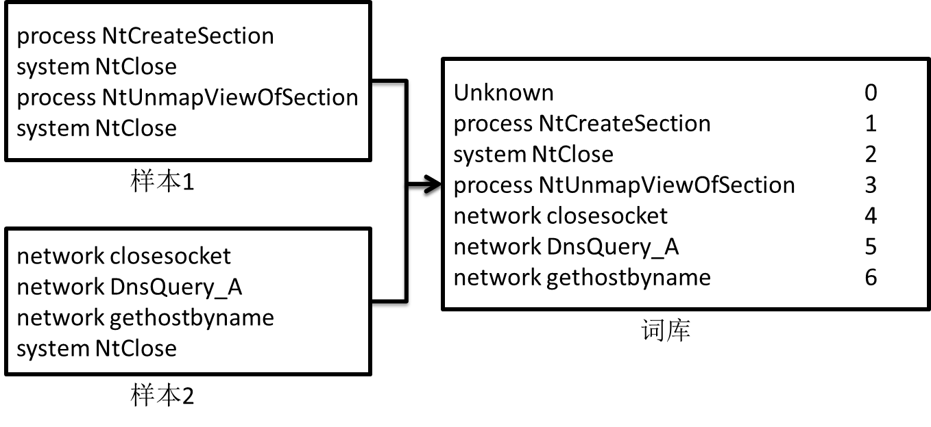在动态行为文本中的每一行表示一个动态行为,将一行视为一个整体,遍历所有的动态行为日志,获取所有出现过的动态行为,作为词库。用连续数字对词库中的每一个词进行标号,这样可以获取动态行为到标号id的映射。注意,除了出现过的动态行为外,还另外添加了一个“Unknown”动态行为,用于之后匹配不在词库中的未知行为。