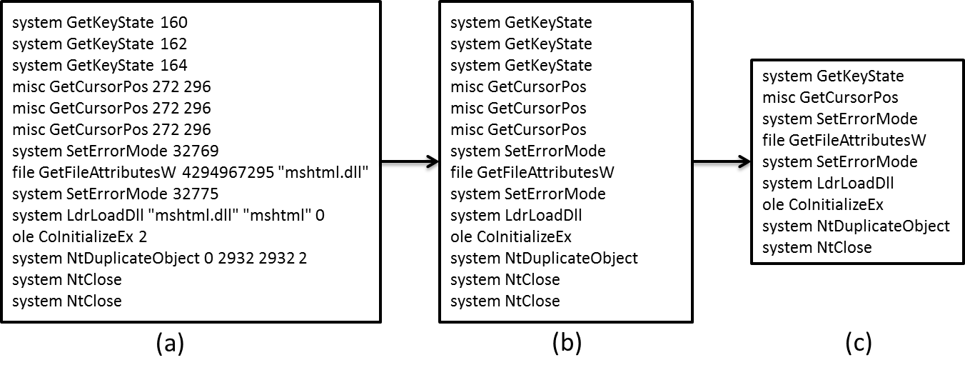 一部分是api类型,对应原始report.json中的category字段;第二部分是调用的api名称;剩下部分是调用过程中的相关参数。在实际实验过程中发现,不考虑参数信息时算法效果更好,所以去除了动态行为的参数信息,如下图(b)。最终使用时对于相邻的重复api调用只考虑一次,相当于做了去重处理,如下图(c)。经过处理后每个样本的动态行为日志信息可以得到大幅度精简。