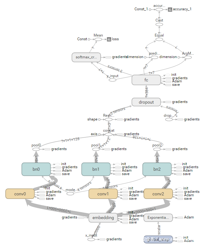 本文采用Tensorflow实现算法结构。整体流程的计算图如下图所示。Embedding是词嵌入部分,即将动态行为文本转换为二维,conv对应上面介绍的卷积操作,pool对应max-pooling,fc为全连接层,最后结果由softmax输出。在具体实现时还加入了batchnorm和学习速率指数衰减,用以加速学习和优化结果。注意图中有一个dropout层,但实际使用时keep_prob传入的是1.0,即并没有进行dropout。该层是在调试结果时使用的。