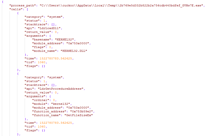通过在沙箱运行样本,获取样本的动态行为报告。这里受限于两个条件:1)样本能跑出动态行为;2)该样本在VirtusTotal上能查询到对应结果。由于当前处于预研阶段,故先采用了部分样本进行试验。动态行为报告格式如下图。