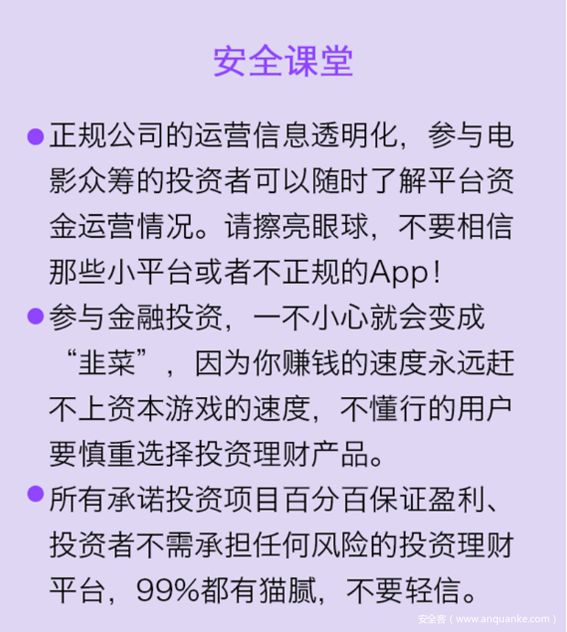 “我们公司主要是票房分成以及后续版权售卖收入分成,加上我们公司有在太平洋公司投保,所以保证您投资的项目百分比盈利!”