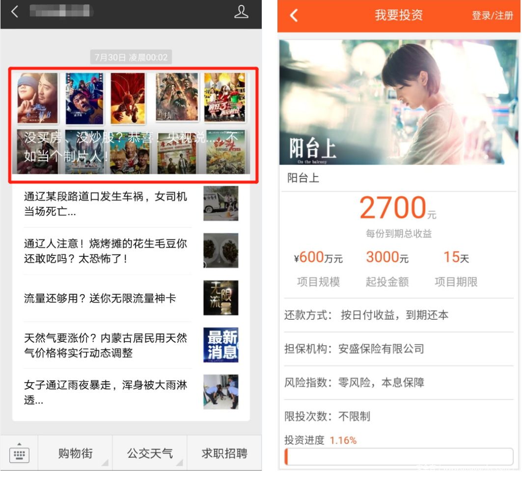 用户通过某微信公众号推送的软文了解到电影众筹项目,按照引导下载并安装了中视影业App,其中某部电影宣称起投金额3000元,项目周期15天,收益分红2700元。