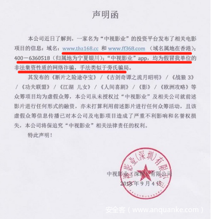 360手机先赔接到用户关于冒充“中视影业”进行电影众筹诈骗的反馈,主要渠道为引导用户下载安装平台App,利用高利息引诱投资人充值,随后平台卷款跑路。一场以“电影众筹”为名的非法集资的庞氏骗局浮出水面。