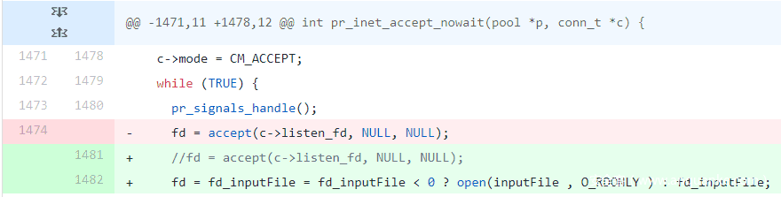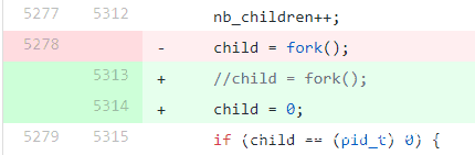 在没有这些选项的情况下,为了避免fork(2),我们只需删除实际的fork(2)调用,并硬编码返回值0,代码就会沿着预期的子进程执行路径继续执行: