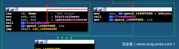 我们可以看到,代码所创建的mutex名叫“AHK Keybd“。根据Google的搜索资料我们可以了解到,这是一个标准的AHK可执行程序,实际的AHK语言代码存在于每个PE文件的resource区域中(RCDATA)。