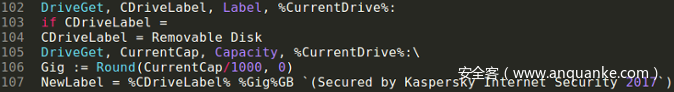 比如说,如果目标设备挂载了一个名叫”Pendrive”的8GB USB驱动器,并执行了键盘记录工具,那么恶意软件会将这个USB驱动器的名字改为”Pendrive 8GB (Secured by Kaspersky Internet Security 2017)”,而这也是其中一个可以直接识别的入侵威胁指标IoC。