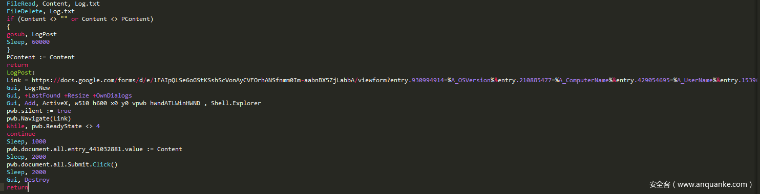 需要注意的是,这个文件还可以将Log.txt文件中的键盘记录数据提取到Google表单中,而这绝对是一种非常聪明的数据提取方法。