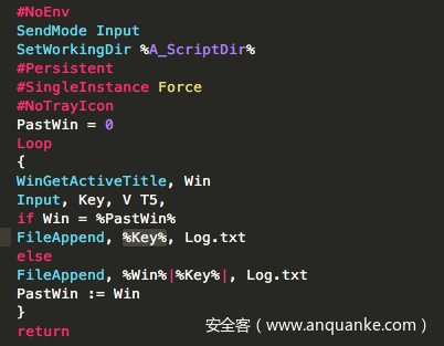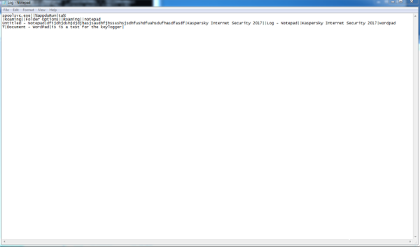 Svhost.exe可以通过AHK函数WinGetActiveTitle()监控捕捉到焦点的活动窗口,然后调用AHK函数input()来监控用户在该窗口中的输入。所有的键盘记录数据会保存在一个名叫“Log.txt“的文件中,该文件的存储路径为“%APPDATA%Kaspersky Internet Security 2017”。键盘记录数据样本如下图所示:
