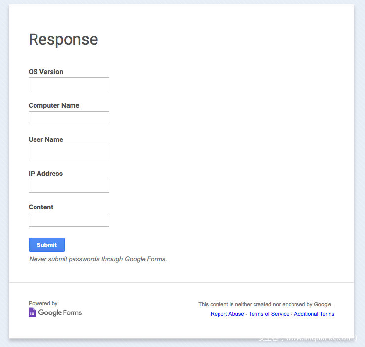 这也就意味着,攻击者不需要再去利用各种命令以及控制服务器来传递数据,而且对于很多流量监控机制来说,这些也不会被当作可疑流量。下图显示的是用于数据提取的Google表单: