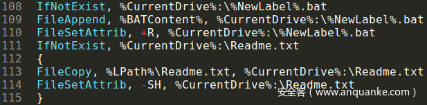 这款恶意软件还会创建一个指向batch脚本的autorun.inf文件,脚本内容如下: