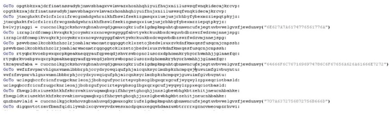 在初步观察下可以发现本次攻击和Hades样本都使用了结构相似的随机的变量名,并且一些字符串都转成了十六进制字符串的形式。
