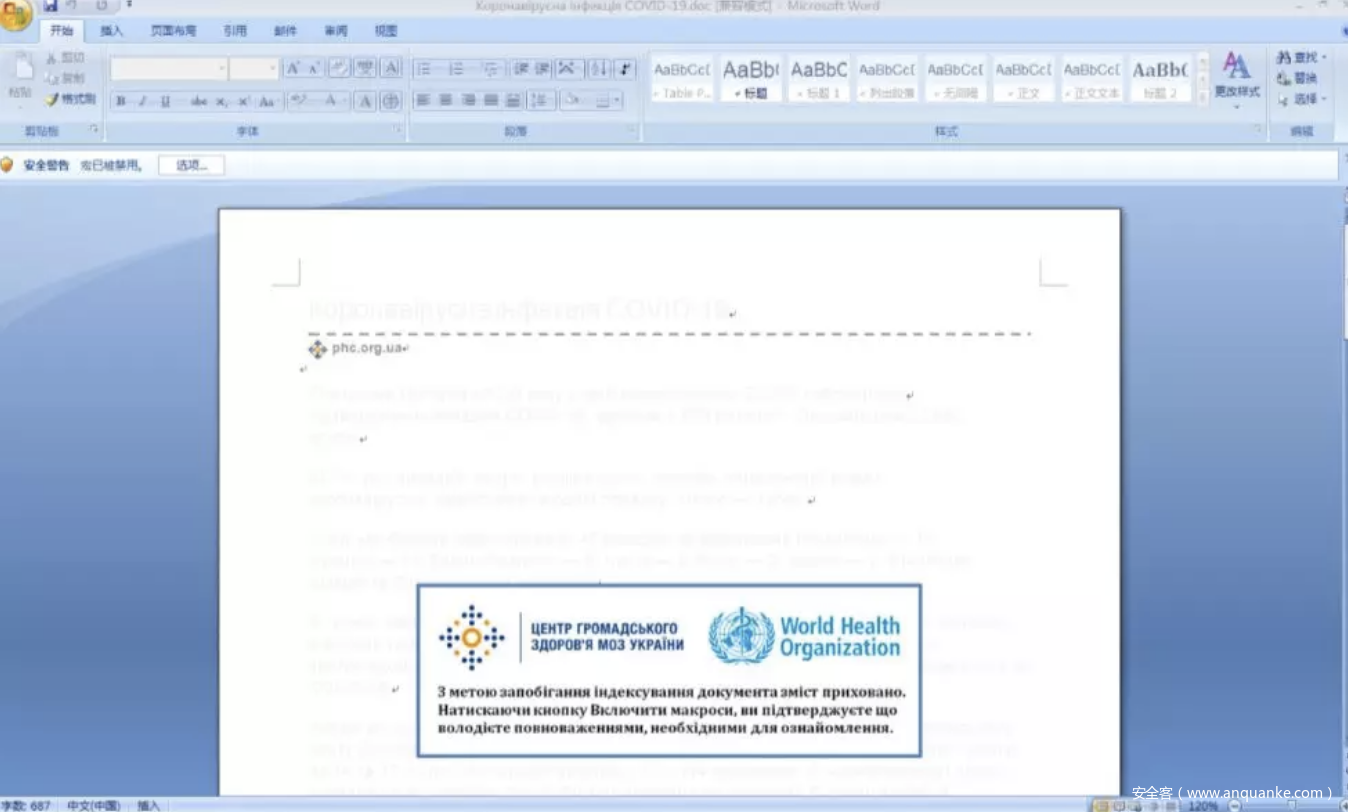 这次攻击采用了带有恶意宏代码的伪装文档。标题为“Коронавірусна інфекція COVID-19.doc”(冠状病毒感染COVID-19.doc)。