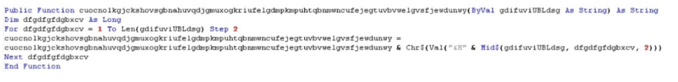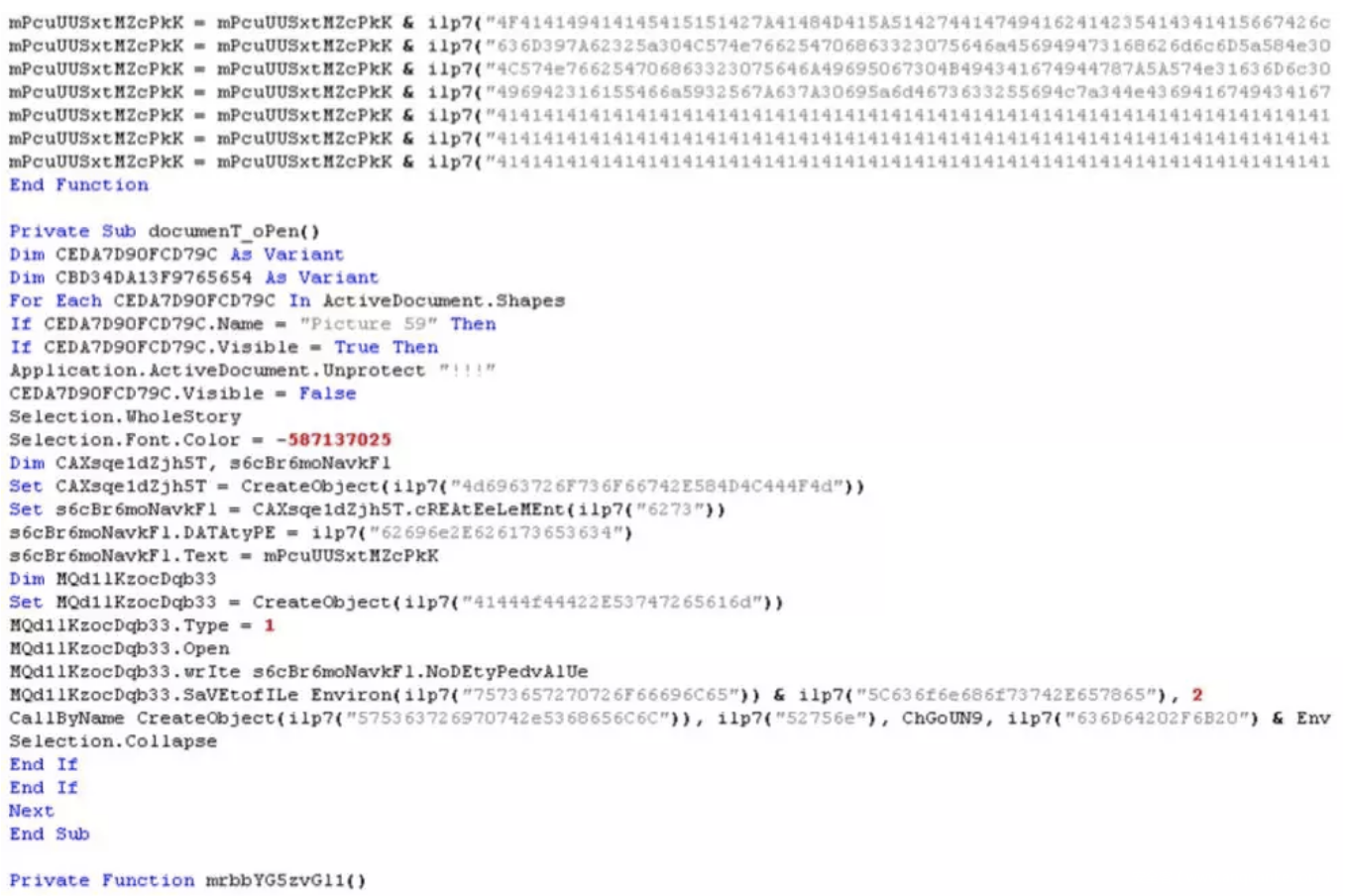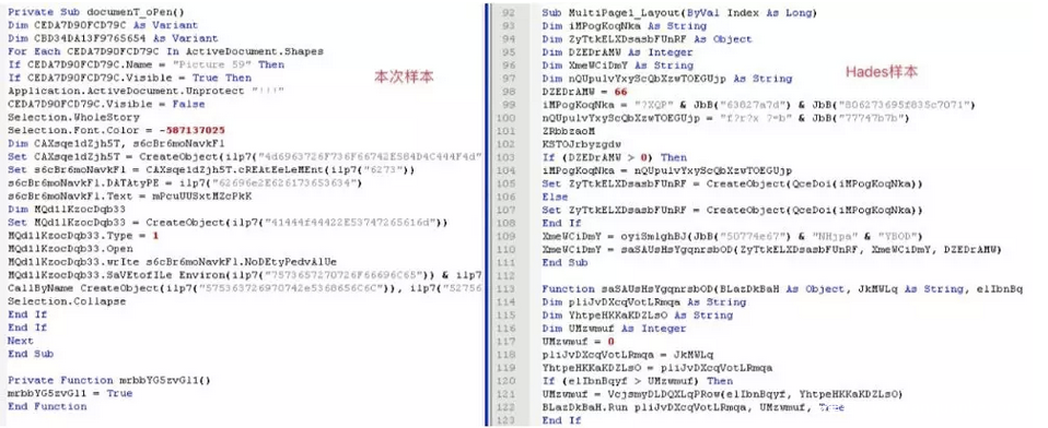 以e2e102291d259f054625cc85318b7ef5样本为例,将该样本暂时命名为“Hades样本1”,来和本次攻击样本的宏代码进行比较。
