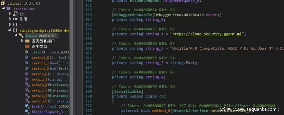 恶意程序conhost.exe由C#编写,并硬编码了一个回连地址