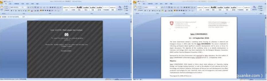 在文档展现方面,Hades的一些样本也会进行一定的伪装,在宏代码未被执行前,文档内容