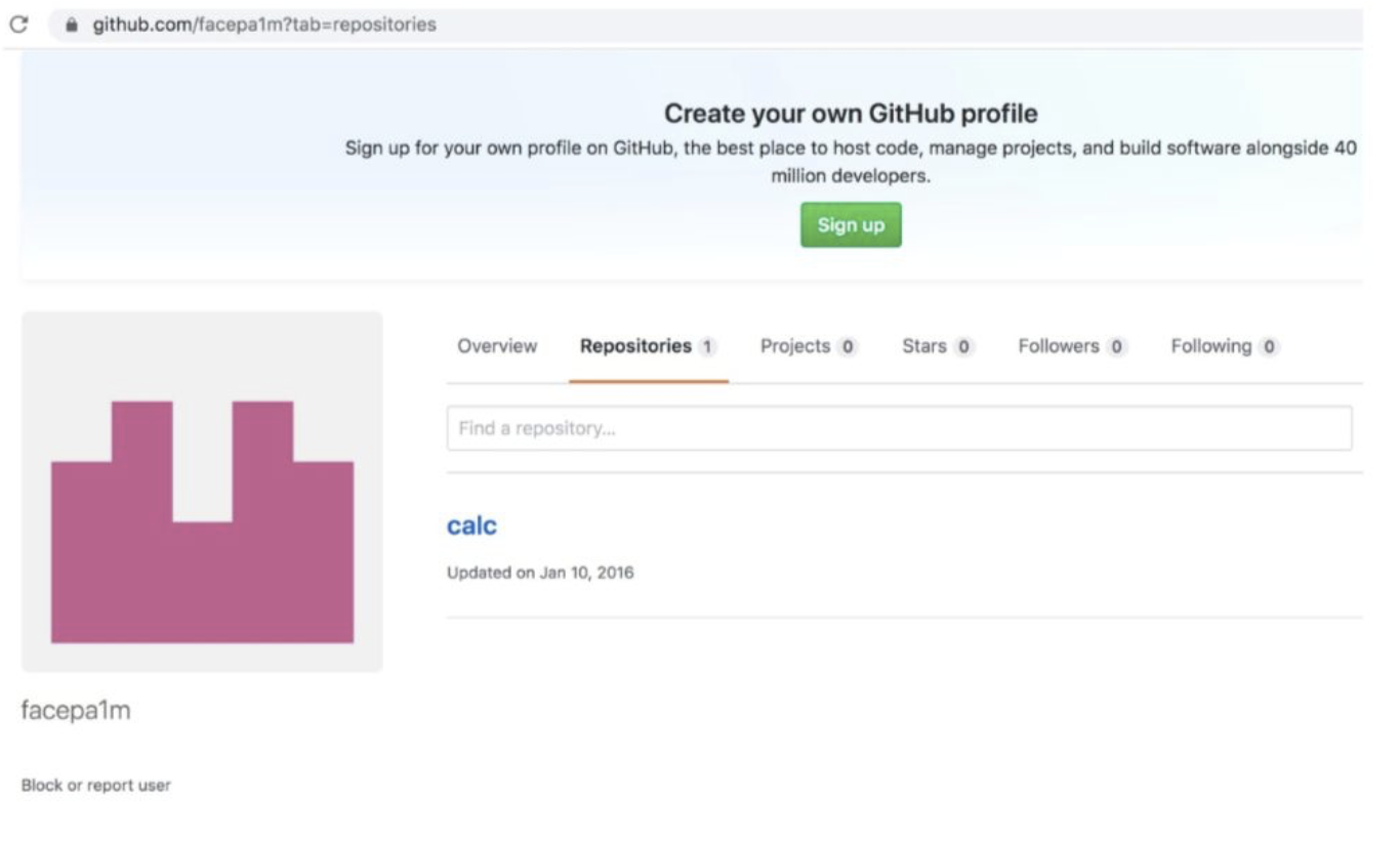 并在Github上发现了一个同ID的用户,仅在2016年创建过一个仓储,内容是空的,不过仓储名称calc引发了一定的联想。