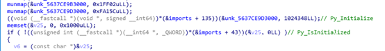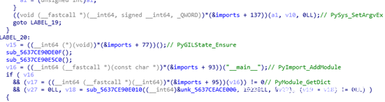 4. 之前已经将python api的地址存储在imports变量内,之后的调用也是通过imports变量来进行的,还原一下调用的python函数的符号,可以看到样本初始化python环境和执行的整个过程。