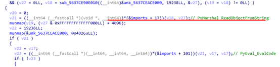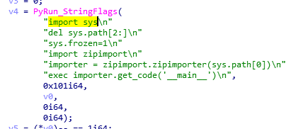 看到PyMarshal_ReadObjectFromString函数的时候,可以得知该样本使用脚本式来执行python的代码。