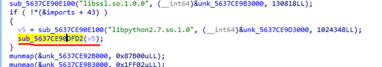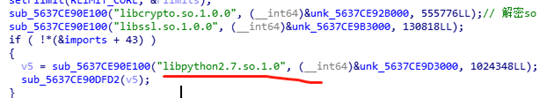 1. 分析该样本,发现该样本会在内存中解密释放libpython2.7.so.1.0这个so文件。该文件是python2.7的核心文件,导出函数都是python重要的api函数。