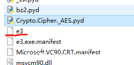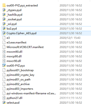 我们大致可以看到,解包后的文件有很多。会有很多Python运行必要的组件和第三方组件,如:_socket.pyd、Crypto.Cipher._AES.pyd等。我们可以在文件列表内看到一个没有扩展名的文件: