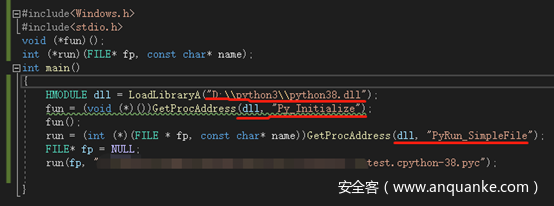 我们准备一个简单的C代码来调用此pyc文件。