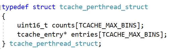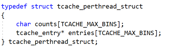 其中counts数组实际上是用于记录当前这个size中储存的tcache链表长度,而从使用类型也可以看出来,使用char类型导致实际上最大的长度(MAX_TCACHE_COUNT)值是127。