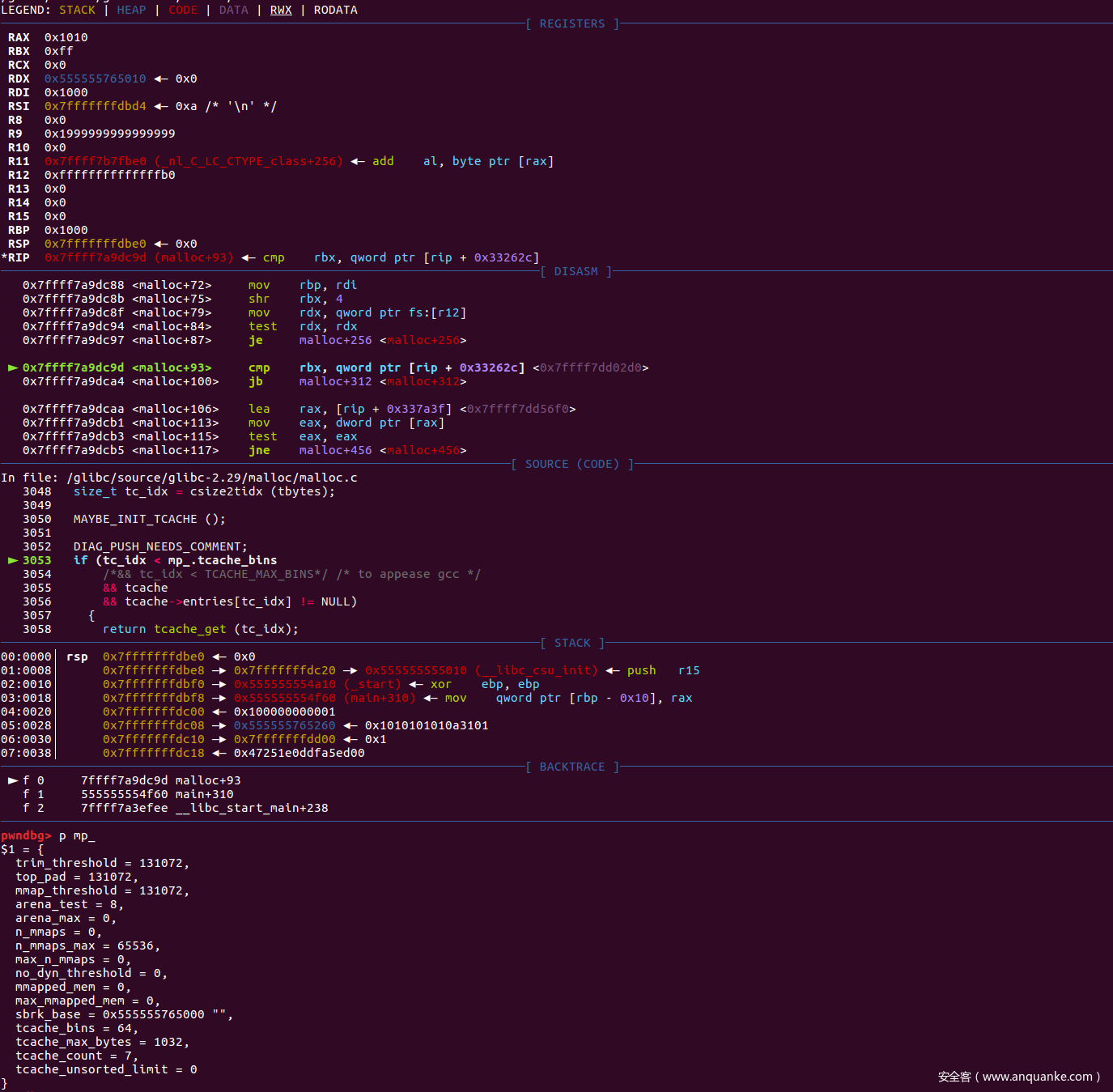 在有源码调试的情况下,我们可以很轻松的定位到mp_.tcache_bins的位置。以下是我用libc2.29的源码调试