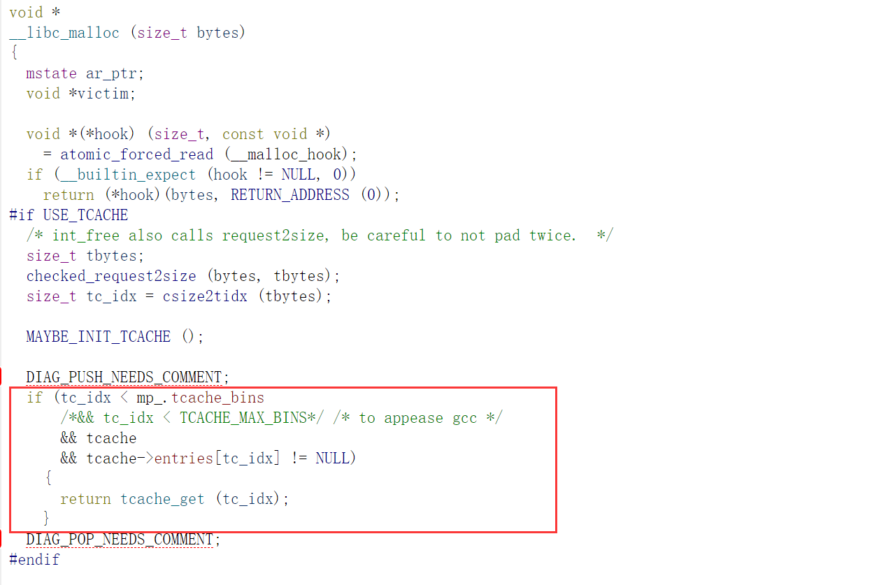 但是我发现在malloc的时候,代码中把tc_idx与TCACHE_MAX_BINS的比对给替换了,从而用mp_.tcache_bins来代替