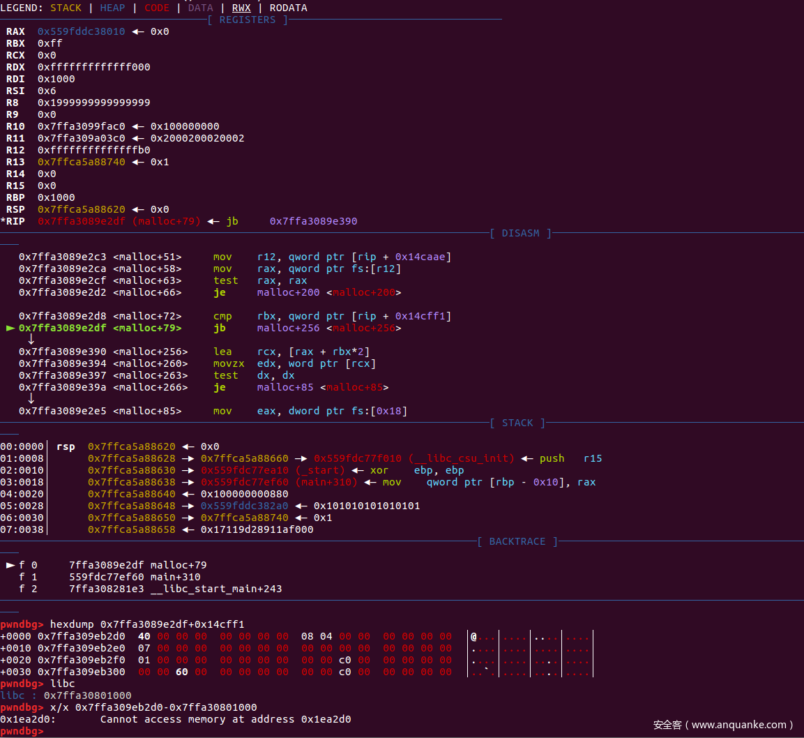 但在没有源码的情况下,我们用题目所给的libc,定位到这个位置是比较困难的,我根据一些直觉找到了这个位置,并且计算出偏移。