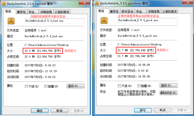 以下,我们以伪造的百度网盘安装程序“BaiduNetdisk_5.5.4.exe”为例分析一下恶意程序的行为。与正常的安装程序相比,该程序不具备合法的数字签名,并且体积较大。