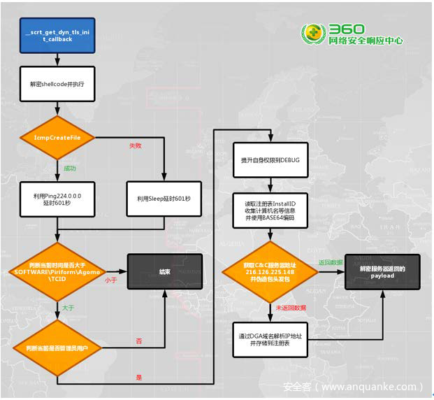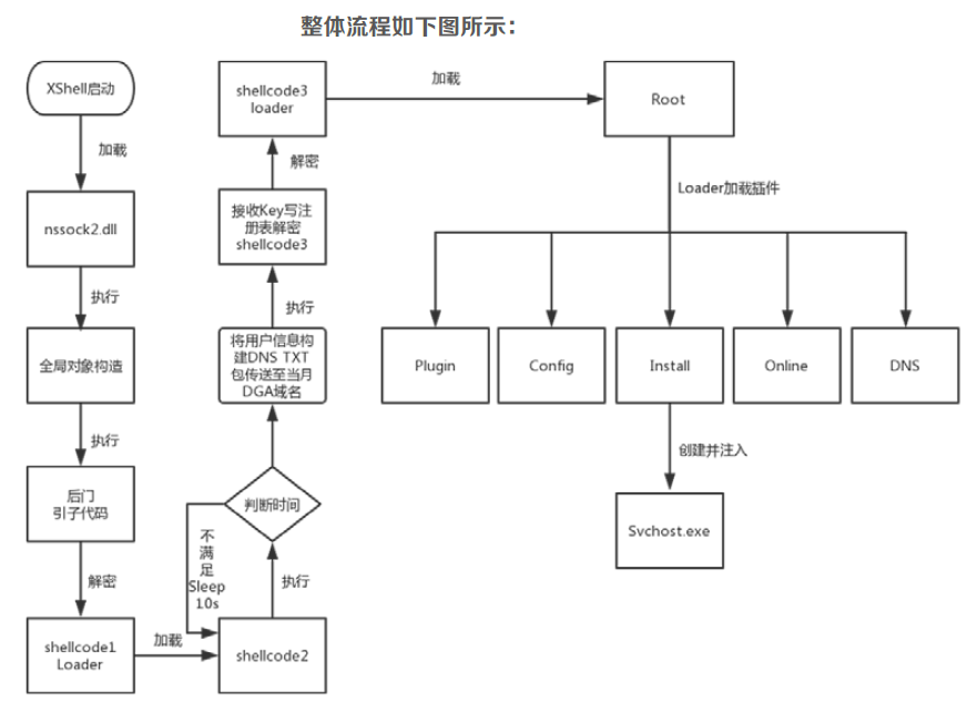 受害者在安装,启动了带有后门的客户端后,nssock2.dll模块中的攻击代码会以Shellcode形式在后台被调用解密执行。