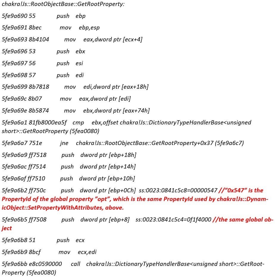 首先,让我们来看看“使用(Use)”过程。当Chakra引擎执行脚本“let opt = buffer.opt;”时,它会将优化后的函数代码的地址存储到全局属性“opt”中,而Javascript对象将作为作为全局对象的属性被Chakra引擎引用。“PropertyId”是一个int32类型的值,用于检索属性。