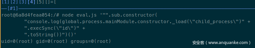 上面的payload与之前的payload类似,不同点在于所创建函数的具体代码。在该代码中,global.process.mainModule.constructor._load与NodeJS中require函数的功能一样。由于我没注意到的某些原因,函数constructor内部无法使用require,因此我只能使用这种不优雅的表达方式。