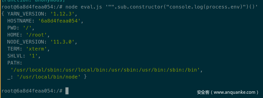 第一个漏洞使用了constructor来构造恶意函数,攻击者经常使用这种技术来绕过沙箱。比如,在绕过angular.js沙箱以获得XSS攻击点的大多数方法中,最终都会使用能够调用constructor的payload。攻击者也常使用这种方法来绕过与static-eval类似的库,如vm2。例如,我们可以通过如下表达式打印出系统环境变量,证实漏洞的确存在(因为沙箱的存在,该操作可能不会成功):