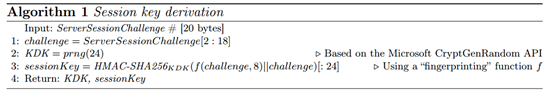 文章指出:Integrity保护算法基于session key和通信内容(即上面提到的“Data”字段)进行MAC值计算(即HMAC-SHA256算法)计算得出,而session key的获得又与Algorithm 1有关,可以看到session key的计算过程比较复杂:f函数以challenge和8作为参数进行运算,结果拼接上challenge内容,基于KDK进行HMAC-SHA256算法运算,得到的结果取前24个字节即为session key。所以“Integrity part”字段计算方法方式可以描述如下: