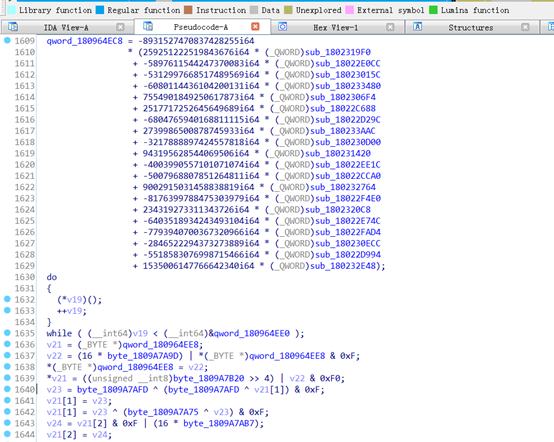 居然复杂到IDA无法打开的地步?百度了一通关于IDA如何解决上述错误问题,最终还是没能解决,或许是IDA的版本(v6.8)过低?更换了一个7.2再次尝试,F5之后的代码超过1600行,各种函数、数据运算,到此我们可以忽略这一个函数了。