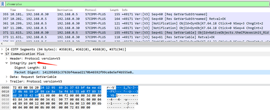 数据中有一个长度为32字节的“Intergity part”字段,该字段即为数据一致性校验,其通过某种算法,以“Data”字段数据为对象进行某种运算,最终得到32字节的校验值,只有当该校验值计算正确、PLC校验通过后,才会执行操作指令如启动/停止,否则,即使与PLC建立了通信,也无法进行实质操控。