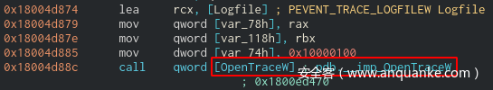 打开wevtsvc.dll进行分析后,我注意到它将打开一个OpenTraceW函数跟踪会话。