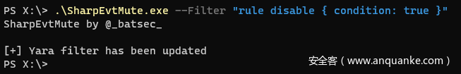 .\SharpEvtMute.exe --Filter "rule disable { condition: true }"