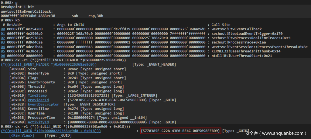 EVENT_HEADER结构将包含更多关于事件的信息,包括报告事件的提供者。通过windbg的一个功能,我们能够获取这个提交者的GUID。