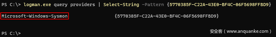 现在我们有了提交者的GUID,我们可以使用logman.exe程序来查找它,可以看到提交者是Microsoft-Windows-Sysmon。