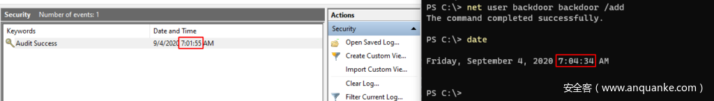 在下图您可以看到,我在7:01清除了事件日志,然后在7:04添加了一个新用户,但是这个事件没有被报告,因为我们的ret在回调中导致了系统范围内的所有事件都不会被报告。
