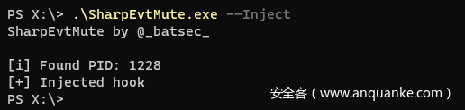 PID可以通过运行”SharpEvtMute.exe —Pid”找到。钩子可以通过你选择的C2框架手动注入shellcode(在EvtMuteBin中运行make)来放置,例如shad0w中的shinject。